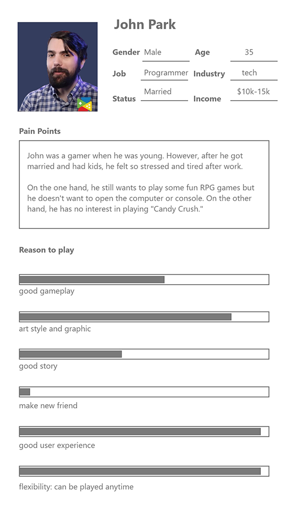 Mythic Heroes is targeting players around 35. It’s a casual, mid-core RPG game. They usually has a high income and little time. Casual games like Candy Crush and Coin Master take up most of the mobile game market in North America. However, there are very few mid-core games.
